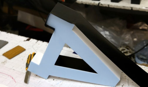 - Раскрой и формовка. Изготовление лицевой части из акрила и боковых стенок (контура). Боковины могут быть выполнены из алюминиевого композита или пластика.
