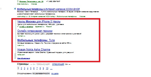 Рекламный блок внизу страницы вмещает до четырех объявлений, отобранных для гарантированных показов. Для увеличения количества переходов на сайт ко всем объявлениям рекламодатели могут добавить быстрые ссылки.