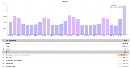 В отчете предоставляется информация о действиях всех типов роботов, посетивших сайт. Данные распределяются по правилам фильтрации. Долю роботов за выбранный отчетный период в ряду всех посетителей сайта можно увидеть на общей диаграмме.