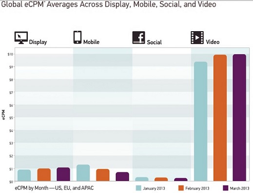 Что касается мобильной рекламы, то за тот же промежуток времени ее цена упала с 1,31 долл до 0,72 долл, то есть на 45%. eCPM рекламы в социальных медиа упал с 30 центов до 24, то есть на 20%. Однако здесь нельзя не отметить, что данный вид рекламы (речь о рекламе и ретаргентинге в Facebook) пользуются огромнейшим спросом, показы здесь считаются уже миллиардами – и это только на платформе Turn.
