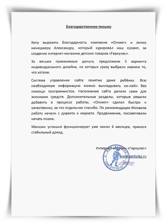 Хочу выразить благодарность компании «Олимп» и лично менеджеру Александру, который курировал наш проект, за создание интернет-магазина детских товаров «Геркулес».