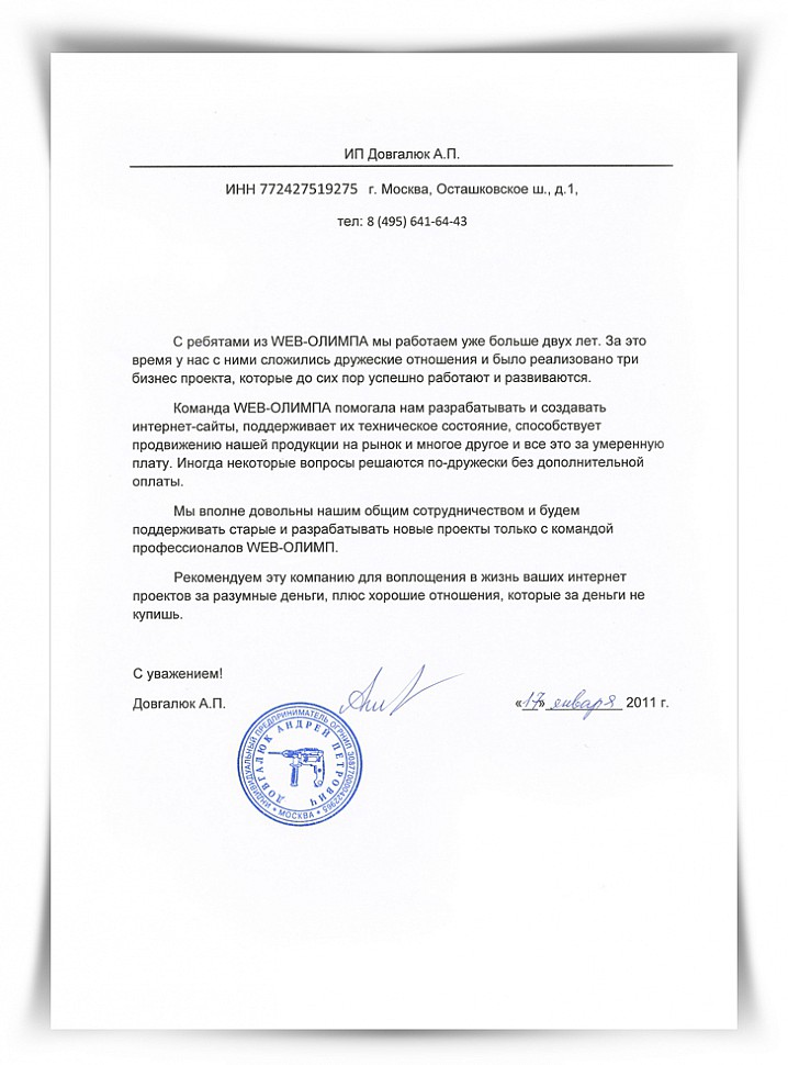 Мы вполне довольны нашим общим сотрудничеством и будем поддерживать старые и разрабатывать новые проекты только с командой профессионалов WEB-ОЛИМП.