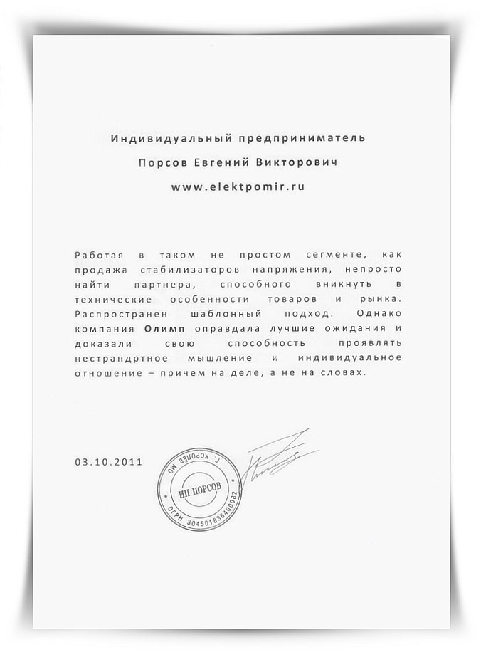 Работая в таком не простом сегменте, как продажа стабилизаторов напряжения, непросто найти партнера, способного вникнуть в технические особенности товаров и рынка. Распространен шаблонный подход. Однако компания Олимп оправдала лучшие ожидания и доказали свою способность проявлять нестандартное мышление и индивидуальное отношение – причем на деле, а не на словах.