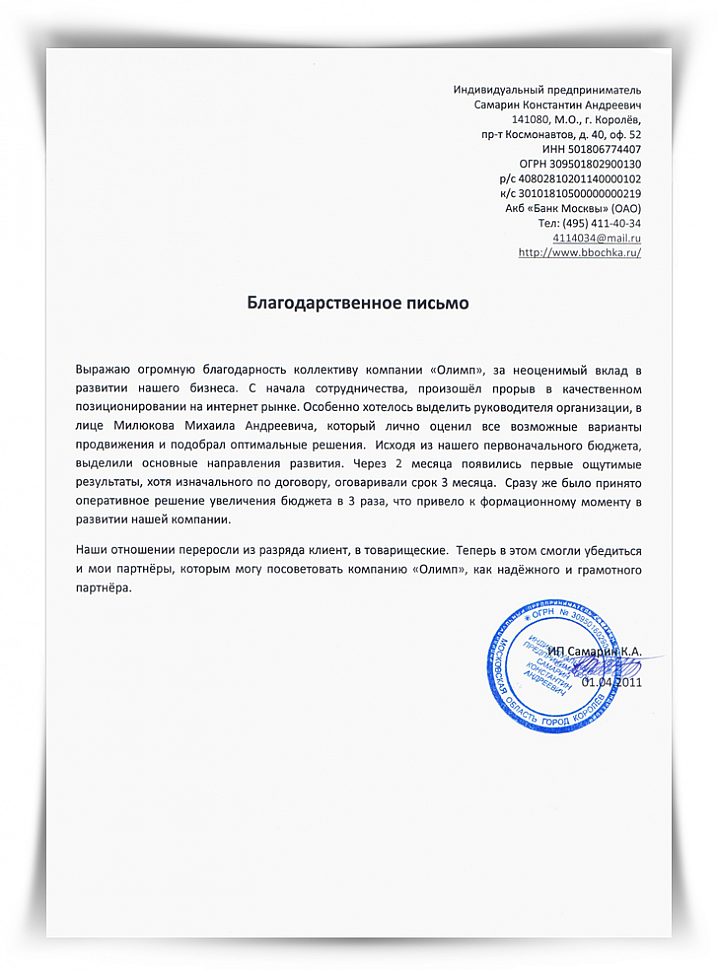 Выражаю огромную благодарность коллективу компании «Олимп», за неоценимый вклад в развитии нашего бизнеса. С начала сотрудничества, произошёл прорыв в качественном позиционировании на интернет рынке. Особенно хотелось выделить руководителя организации, в лице Милюкова Михаила Андреевича, который лично оценил все возможные варианты продвижения и подобрал оптимальные решения. Исходя из нашего первоначального бюджета, выделили основные направления развития. Через 2 месяца появились первые ощутимые результаты, хотя изначального по договору, оговаривали срок 3 месяца. Сразу же было принято оперативное решение увеличения бюджета в 3 раза, что привело к формационному моменту в развитии нашей компании.