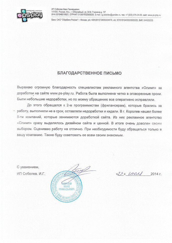 Выражаю огромную благодарность специалистам рекламного агентства «Олимп» за доработки на сайте www.ps-play.ru. Работа была выполнена четко в оговоренные сроки. Были небольшие недоработки, но по моему обращению все оперативно исправляли.