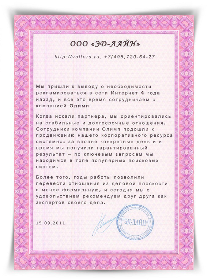 Когда искали партнера, мы ориентировались на стабильные и долгосрочные отношения. Сотрудники компании Олимп подошли к продвижению нашего корпоративного ресурса системно: за вполне конкретные деньги и время мы получили гарантированный результат – по ключевым запросам мы находимся в топе популярных поисковых систем.