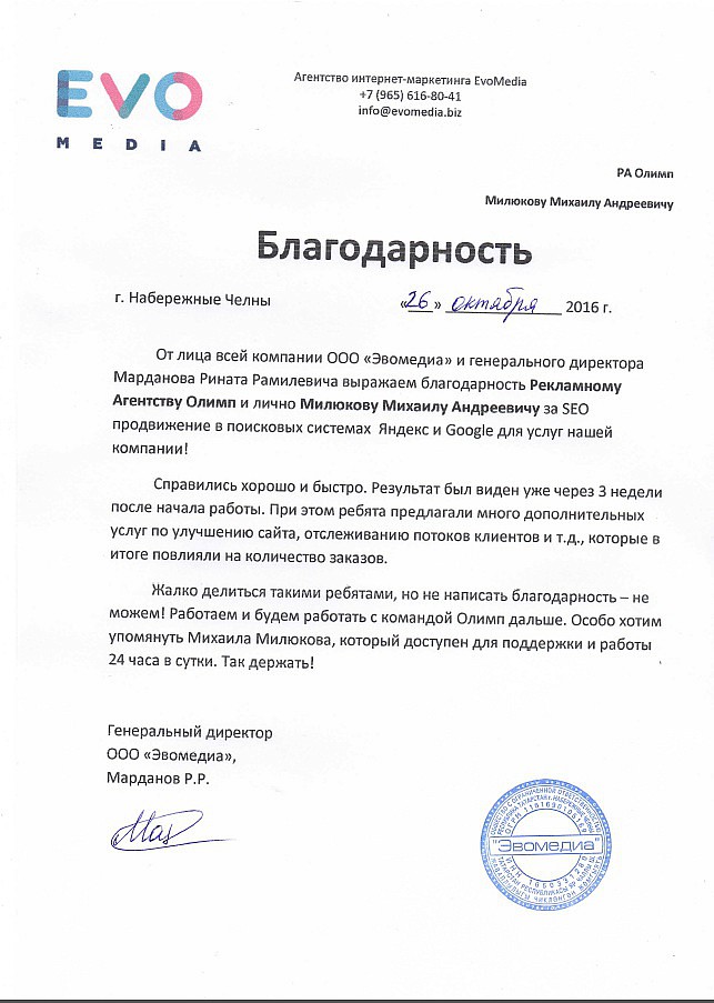 От лица всей компании ООО «Эвомедиа» и генерального директора Марданова Рината Рамилевича выражаем благодарность Рекламному Агентству Олимп и лично Милюкову Михаилу Андреевичу за SEO продвижение в поисковых системах Яндекс и Google для услуг нашей компании.