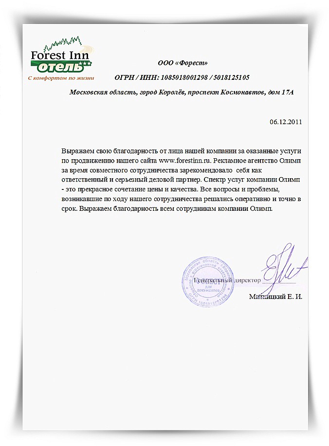 Выражаем свою благодарность от лица нашей компании за оказанные услуги по продвижению нашего сайта www.forestinn.ru. Рекламное агентство Олимп за время совместного сотрудничества зарекомендовало себя как ответственный и серьезный деловой партнер. Спектр услуг компании Олимп - это прекрасное сочетание цены и качества. Все вопросы и проблемы, возникавшие по ходу нашего сотрудничества решались оперативно и точно в срок. Выражаем благодарность всем сотрудникам компании Олимп.