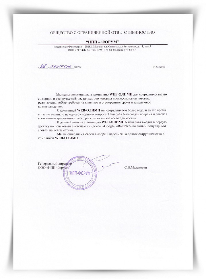 С компанией WEB-ОЛИМП мы сотрудничаем более года, и за это время у нас не возникло не одного спорного вопроса. Наш сайт был создан вовремя и отвечал всем нашим требованиям, а его раскрутка заняла всего два месяца