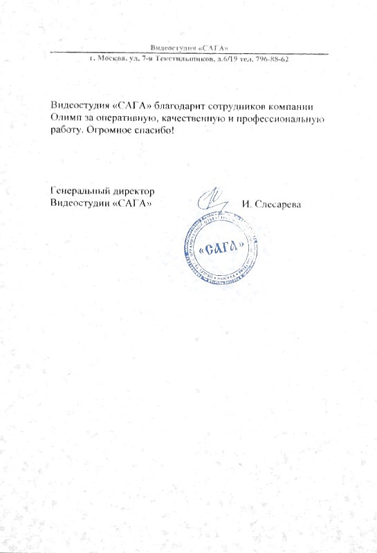 Видеостудия "САГА" благодарит сотрудников компании Олимп за оперативную, качественную и профессиональную работу. Огромное спасибо.