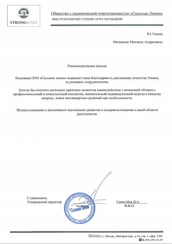 Компания ООО «Сильные линии» выражает свою благодарность рекламному агентству Олимп, за успешное сотрудничество.
